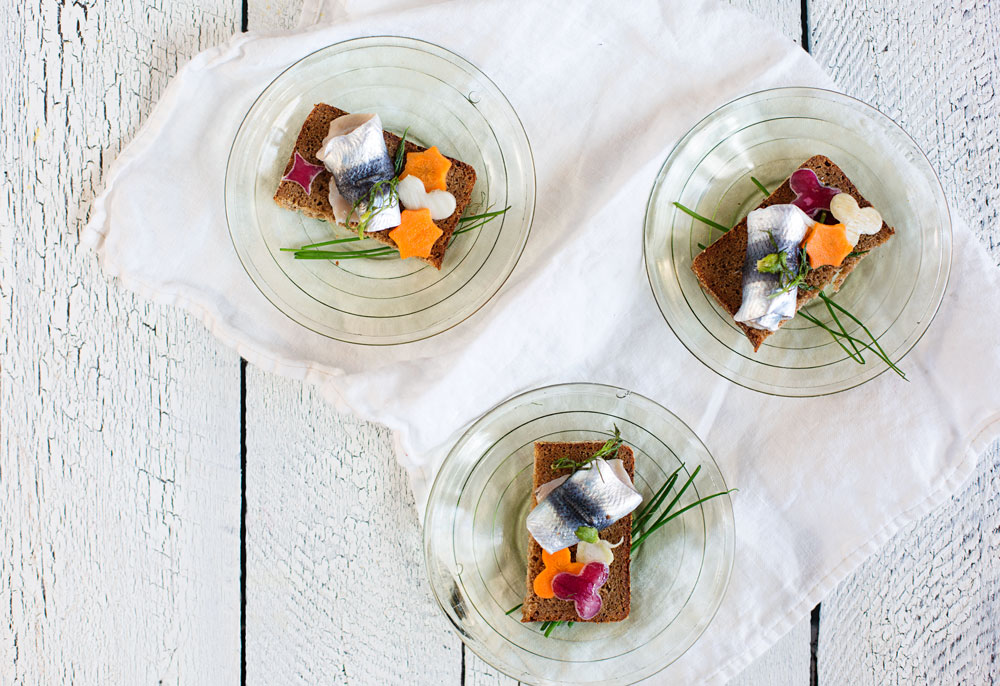 1. Leikkaa silakkafileistä selkäevät saksilla. Asettele fileet nahkapuoli alaspäin vuokaan ja ripottele suolaa päälle, tee näin kerros kerrokselta. Anna fileiden suolaantua noin 6 tunnin ajan.