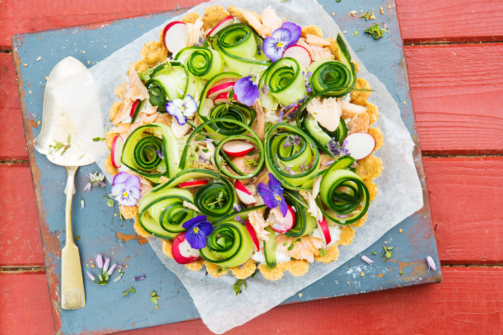 6. Huuhdo kurkku ja retiisit. Vetele kurkusta juustohöylällä ohuita nauhoja ja kieritä ne rullille, asettele kurkkurullat piirakkatäytteelle. Siivuta retiisit ja laita täytteen päälle.