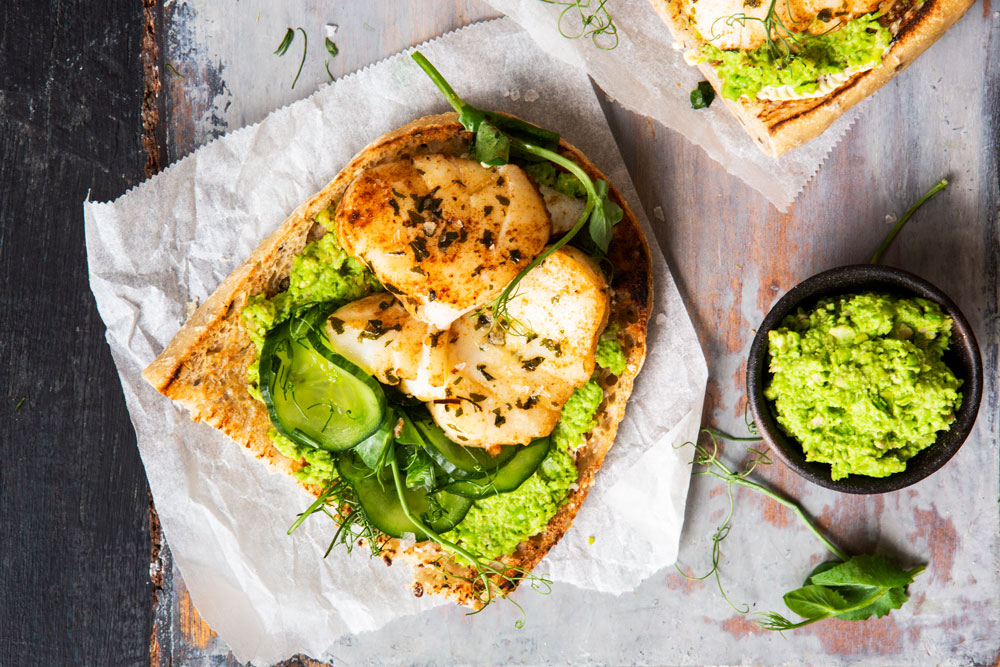 4. Paahda leipäpalat. Lusikoi leiville hernetahnaa, asettele turskapalat ja hölskytyskurkut päälle. Koristele leivät vielä herneenversoilla.