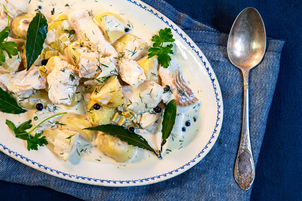 6. Lisää liemeen purjosipuli, pippuri suola ja perunat. Kiehauta muhennos paksummaksi ja lisää kalapalat joukkoon. Lisää muhennokseen vielä persilja ja tarjoa se kuumana.