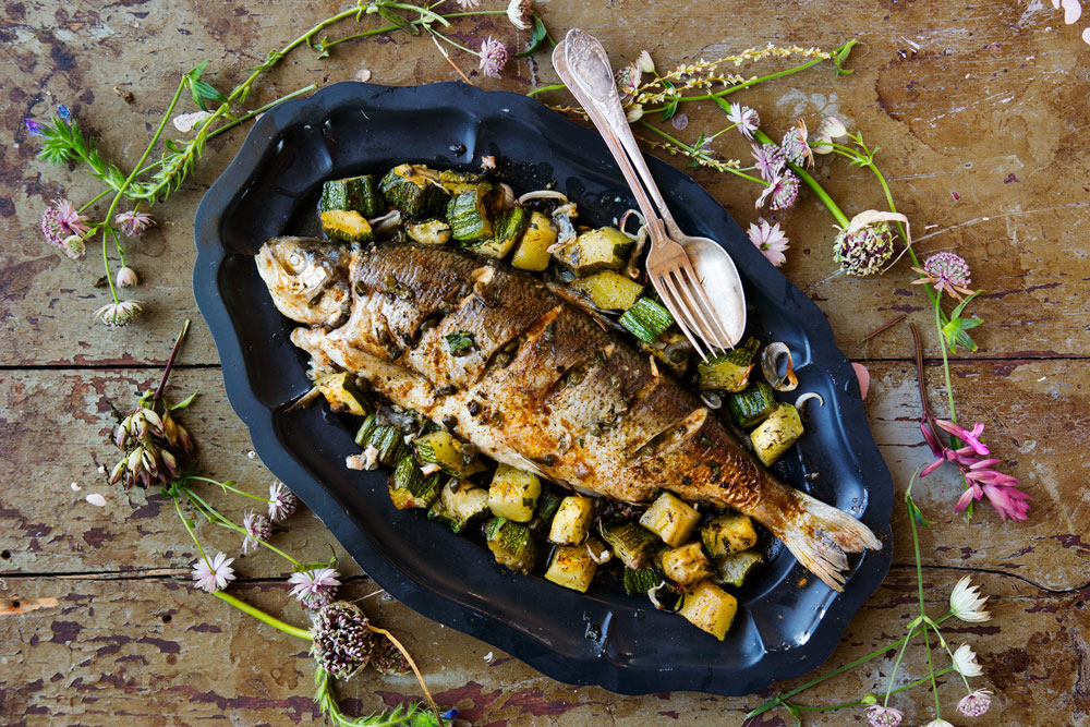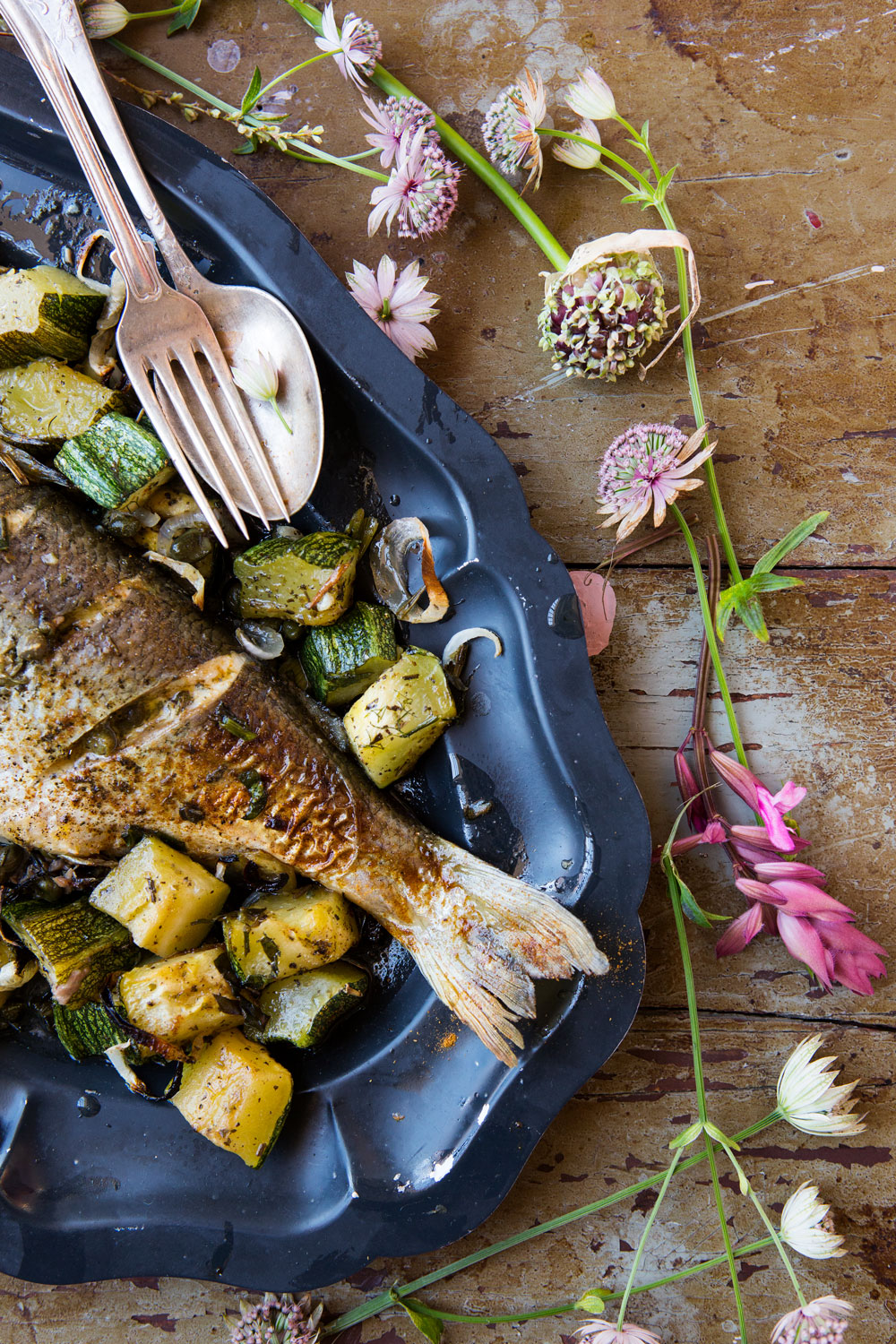 Kokonaisen kalan valmistus sujuu mainiosti uunissa ja samalla pellillä paistuu kesäkurpitsalisäke.